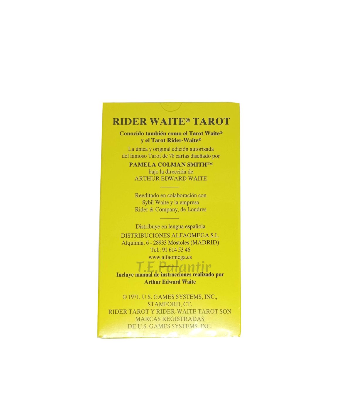 Classic Rider Waite Tarot (Yellow Box) 78 cards. Spanish edition. Original edition designed by Pamela Colman Smith under the direction of Arthur Edward Waite. Includes instruction manual made by Arthur E. Waite himself. Standard size: 120x70 mm.